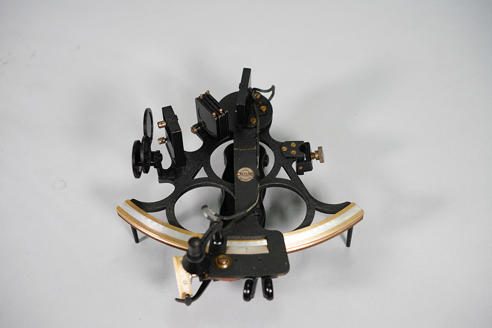 在使用六分仪时,需要手持手柄,移动指标套杆,通过望远镜观察影像,再读取指标,获得角度信息。得到天体的地平高度后,还需要根据航海天文历的数据计算观测点的地理坐标。本架六分仪缺少望远镜和望远镜套圈,但指标套杆等部分仍可正常使用。
