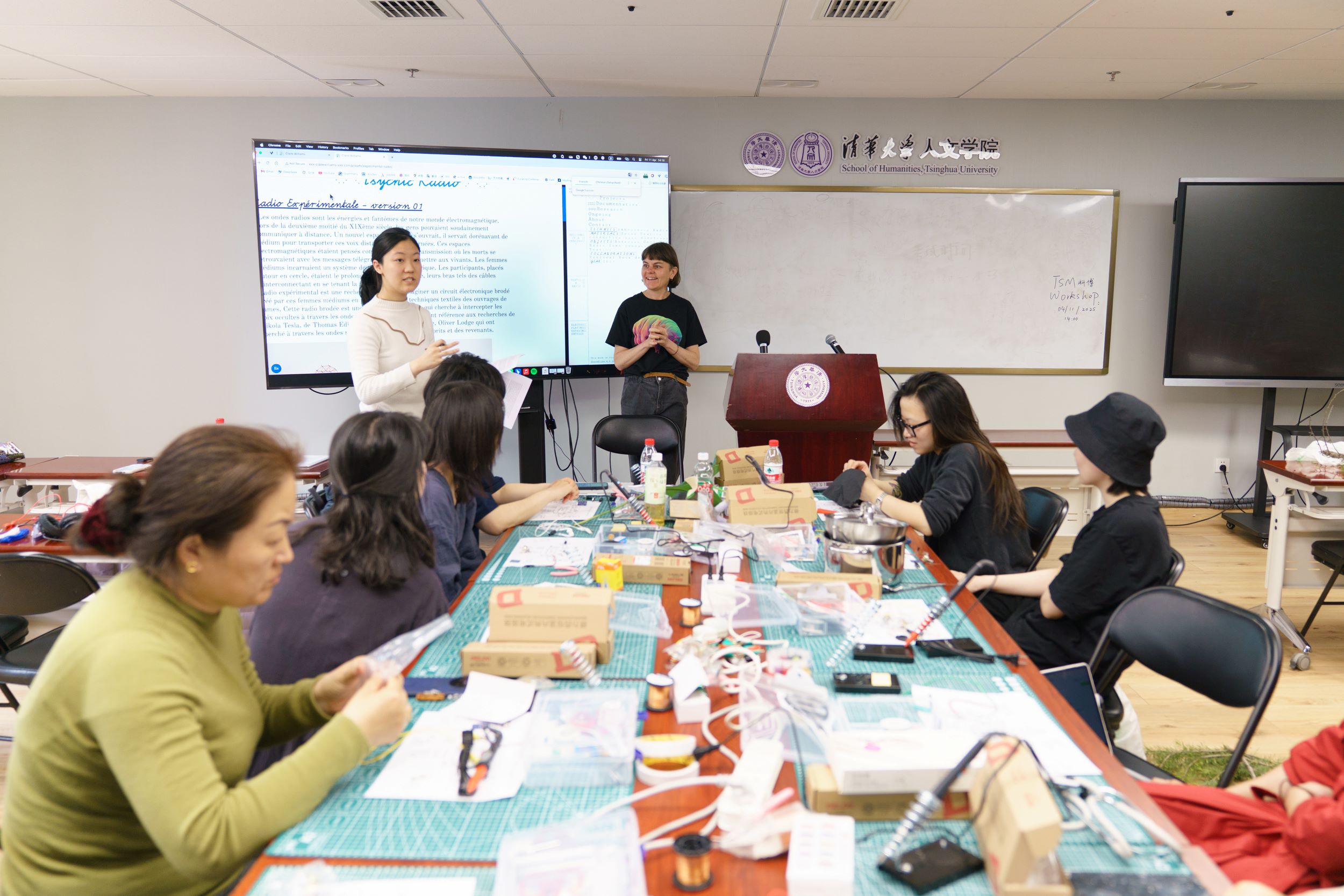 2025 年 4 月 11 日下午 , “聆听你的‘声音织物’:电磁波、纺织与日常物品” 工作坊在清华大学蒙民伟人文楼315举行。该工作坊是清华大学科学博物馆 “电波纪元 —— 无线电技术早期历史展” 的系列活动之一。 “电波纪元” 参展艺术家 Claire Williams担任本次活动主讲嘉宾,王玥涵主持活动。