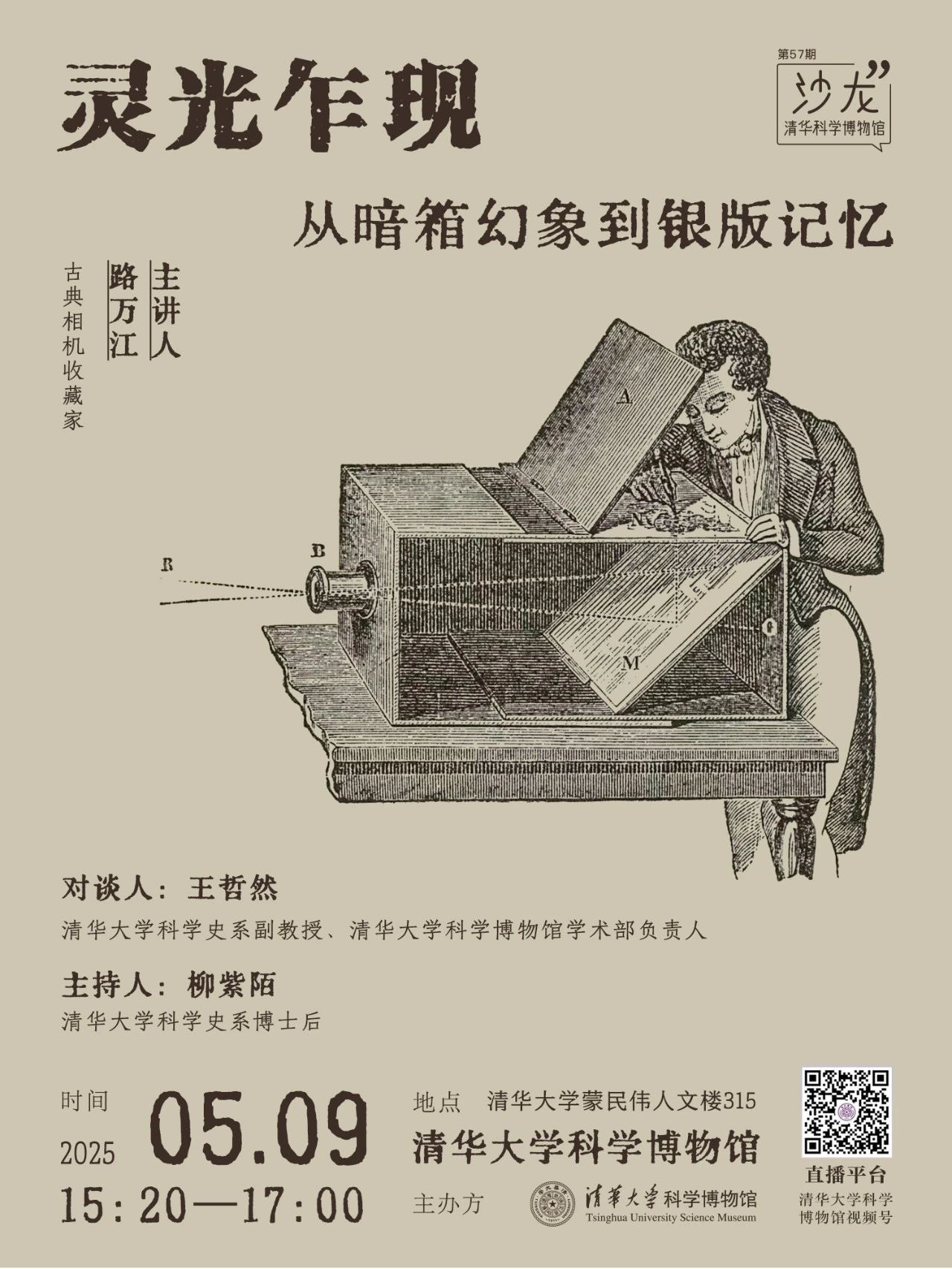 本次沙龙,主讲嘉宾将通过多年来收藏的各式暗箱、明箱、银版相机等光学装置带您走进前摄影时代。从原始暗箱到有镜暗箱的精巧结构变化,从手工描画到底片感光、显影、定影的发展,讲述人类一步步走向摄影术的探索历程。