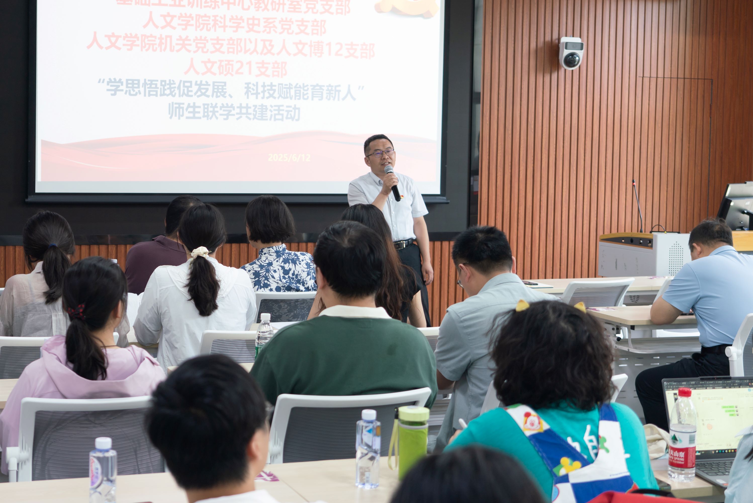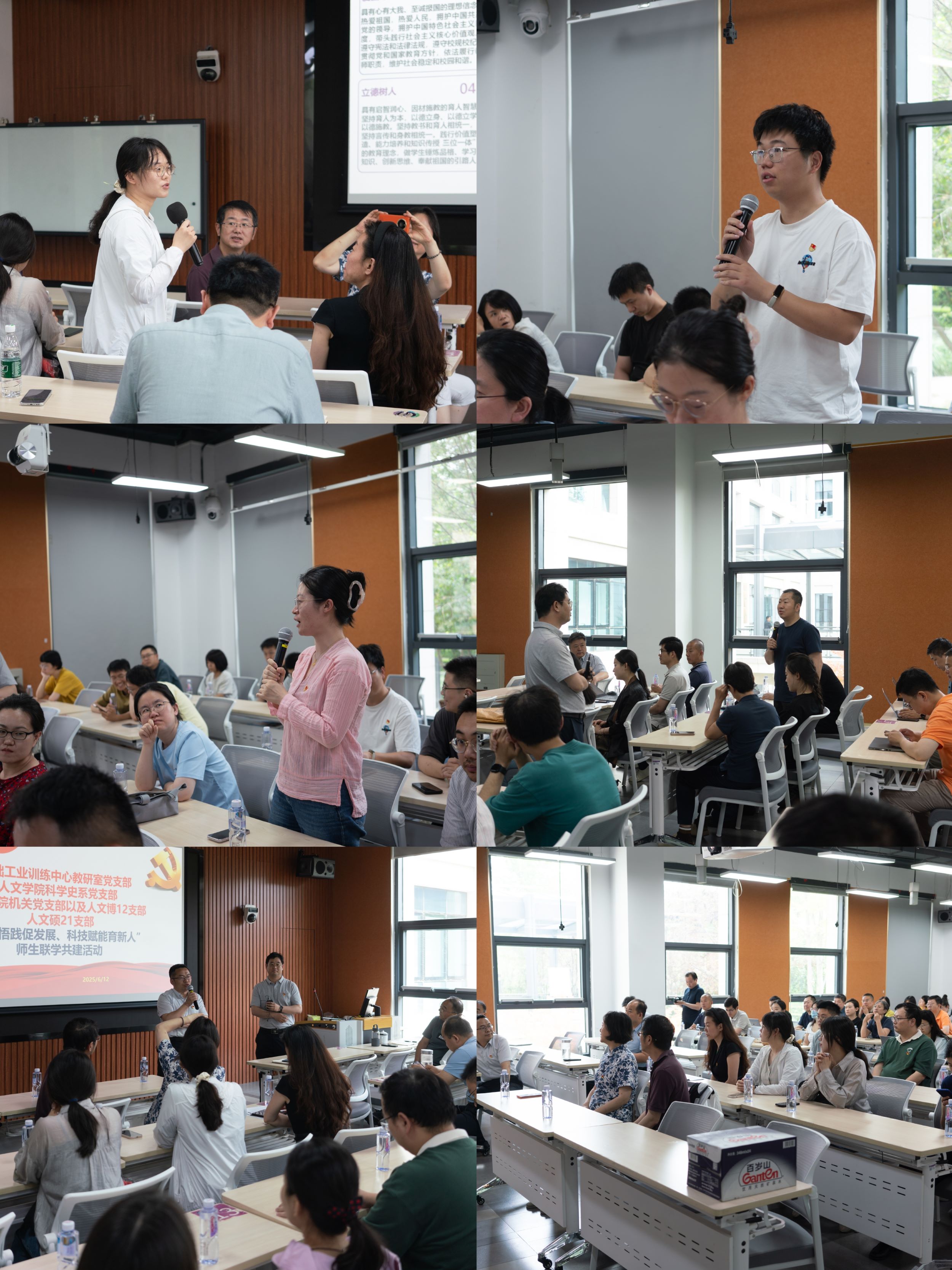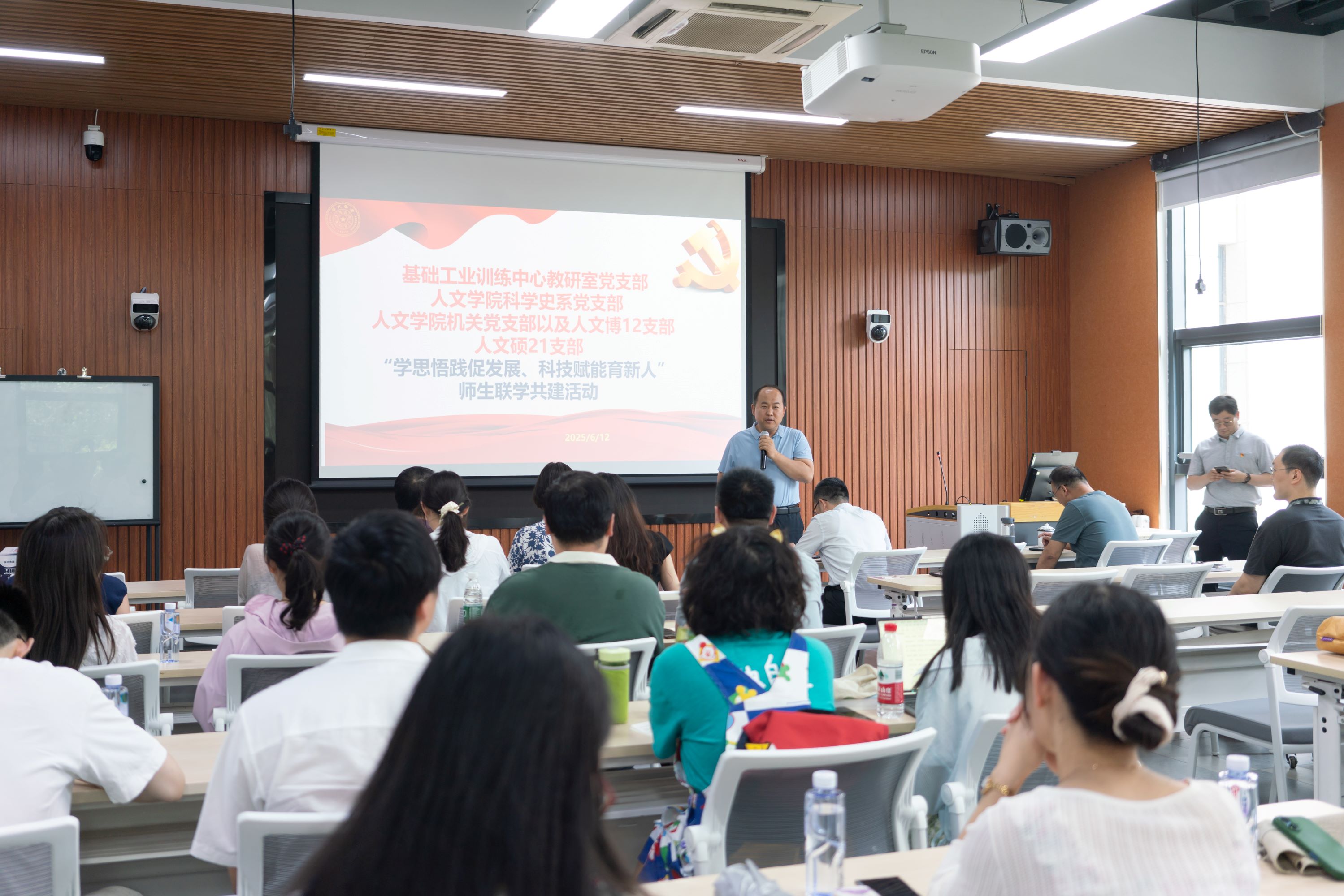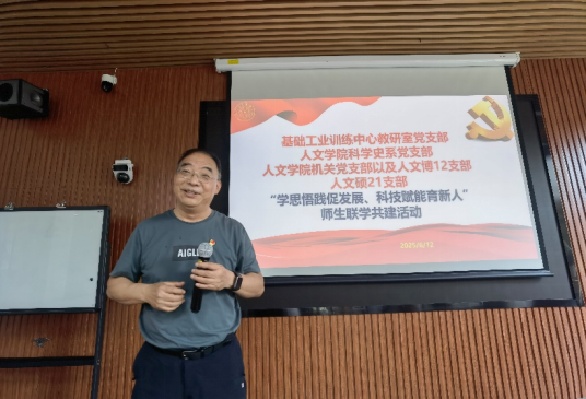 聚焦新质生产力、促进就业实践指导;科技赋能新人文,培育时代思政新人。6月12日,训练中心教研室党支部与人文学院科学史系党支部、人文学院机关党支部以及人文博12支部,人文硕21支部在李兆基大楼B148联合开展“学思悟践促发展、科技赋能育新人”师生联学共建活动。参加本次活动的有训练中心主任杨建新、党总支书记汤彬、教学委员会主任李双寿,人文学院党委委员王巍、人文学院党办主任陈雷、人文学院科学史系党支部书记范爱红等40余名师生党员,本次联学共建活动由学习交流和参观iCenter工程实践场景两个部分组成,学习交流环节由训练中心教研室党支部副书记彭世广主持。