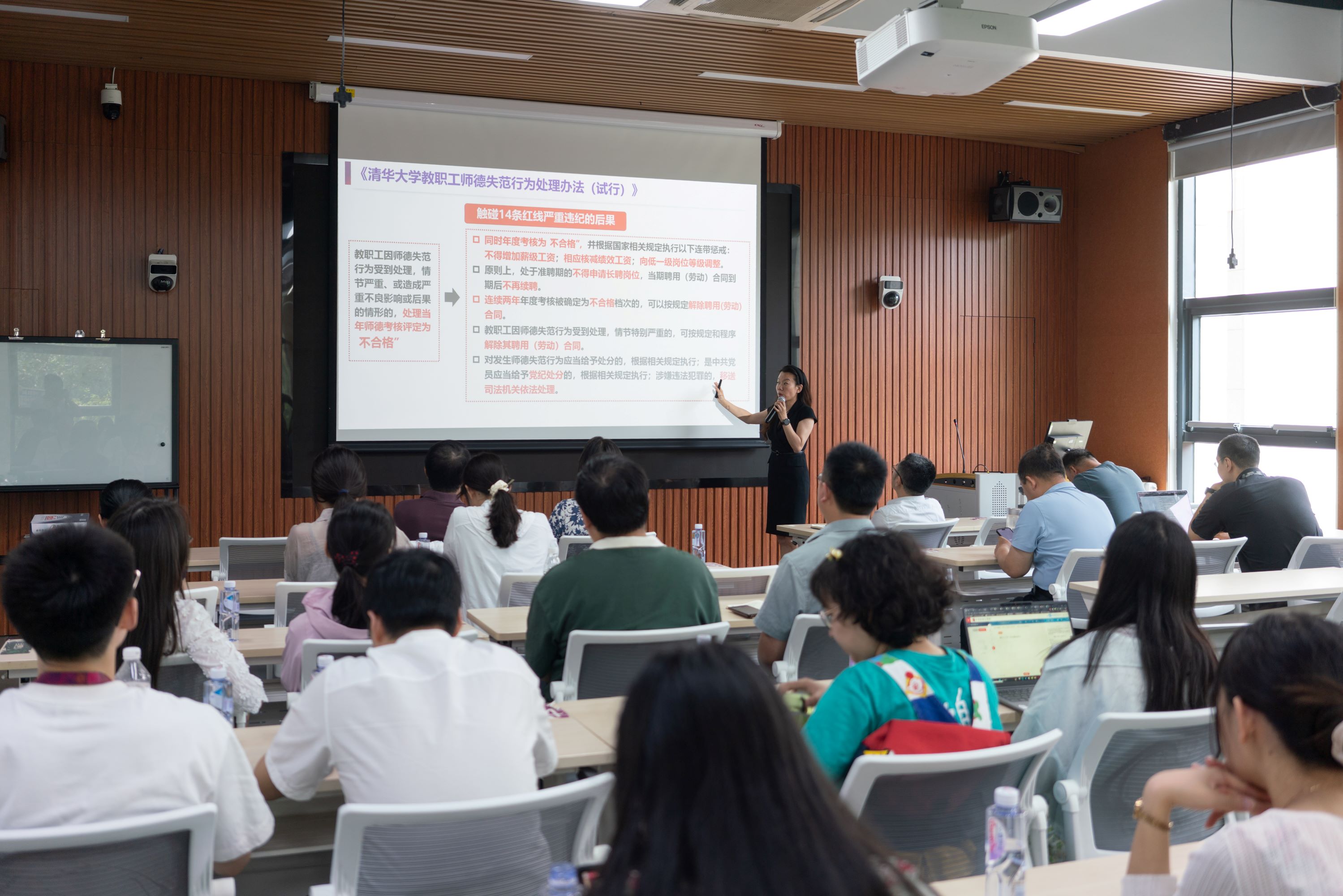随后,人文学院党委办公室主任陈雷老师做“涵养优良师德师风、建设高素质教职工队伍”的专题党课宣讲。她从制度文件制定背景、《清华大学教职工师德失范行为处理办法(试行)》《清华大学教职工师德考核办法(试行)》《清华大学教师职业道德规范》四个方面为在座的师生全面详细地解读了学校师德师风政策的相关规定。