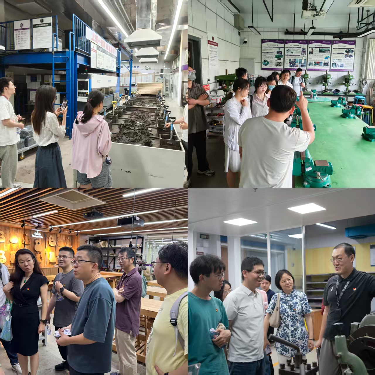 在参观实验室环节,人文学院的四个支部师生被分成三组,在训练中心老师的带领下,先后参观了铸造、焊接、车工、木工、智能制造、SMT、3D打印等实验室。大部分师生是第一次参观工业实践中心的实验室,大家被训练中心丰富的工业实践场景、先进的工业实践设备、精湛的学生工业实践作品所震撼和吸引,不时驻足凝视端详,并与身边的带队老师进行询问和交流,通过亲身感受清华大学iCenter这个全球最大的创客空间,直观感受到新质生产力在生产实践中的应用。