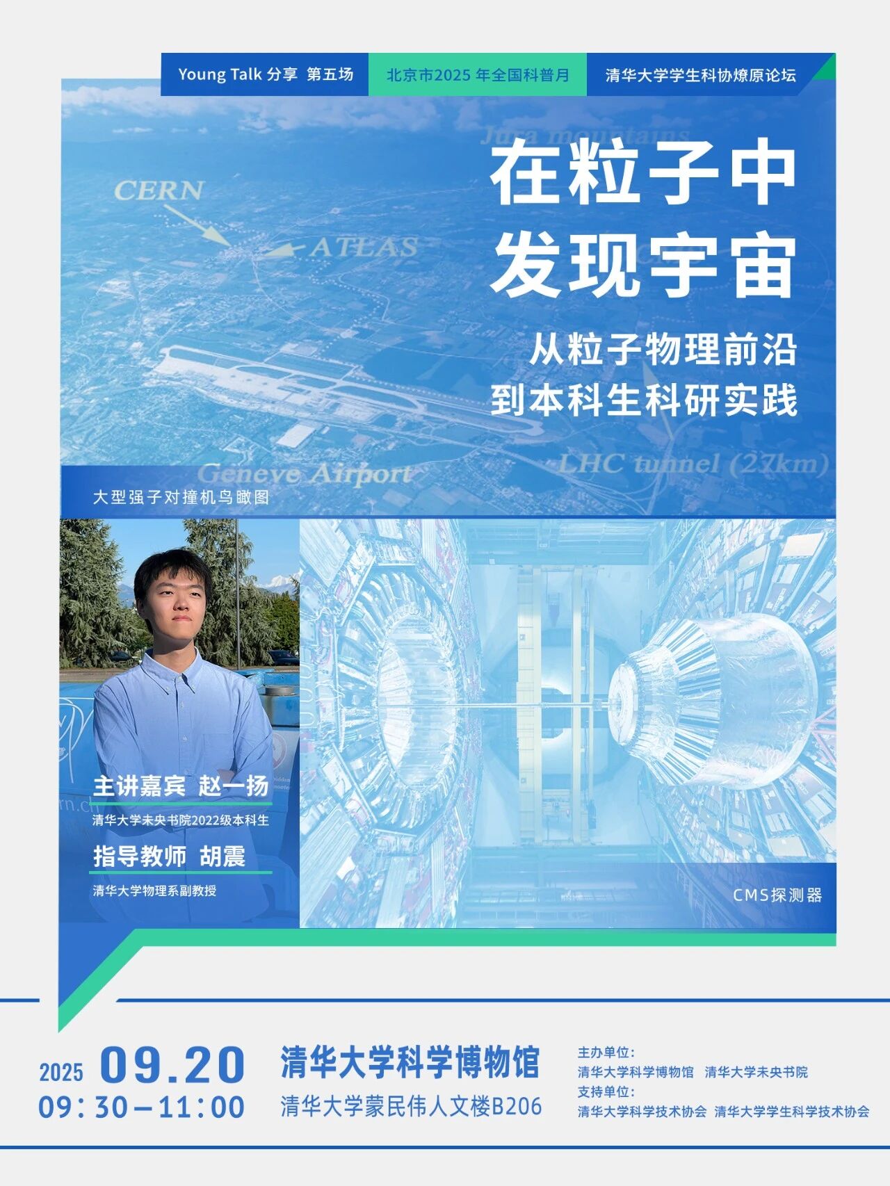 YoungTalk NO.5 预告 | 赵一扬:在粒子中发现宇宙 ——从粒子物理前沿到本科生科研实践 2025年9月16日通知预告 公教活动YoungTalk NO.5 预告 | 赵一扬:在粒子中发现宇宙 ——从粒子物理前沿到本科生科研实践已关闭评论1,015阅读模式 点击图片,了解更多详细内容 点赞 登录收藏 我的公众号 微信号已复制 科博馆微信公众号 微信扫一扫
