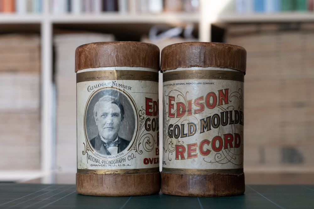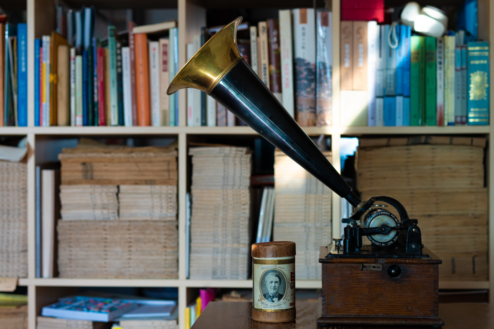 留声机是托马斯·爱迪生最知名的发明之一。 1877年, 在研究电话发射器时, 他产生了用声音将自己的想法快速记录下来的想法。 几个月后,他开始制造一台机器来实现这一想法。 第一台留声机的声音记录在包裹于圆筒的锡箔上,并用手摇曲柄操作圆筒。1877年12月,第一台留声机诞生了, 爱迪生录制了一首儿歌《玛丽有一只小羊》(Mary had a little lamb), 并用机器将声音回放, 让在场的人惊叹不已。另一幕戏剧性的场景出现在爱迪生为留声机申请专利时,他提前将留声机的介绍信息录制下来,在专利局当场将其播放出来,使留声机为自己“申报了专利”。