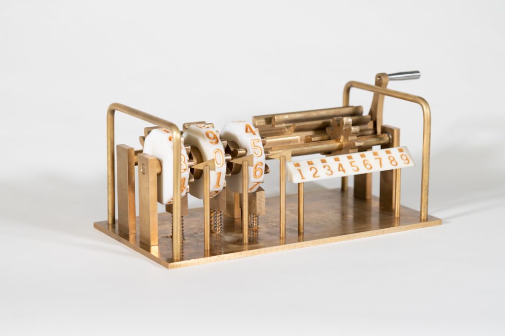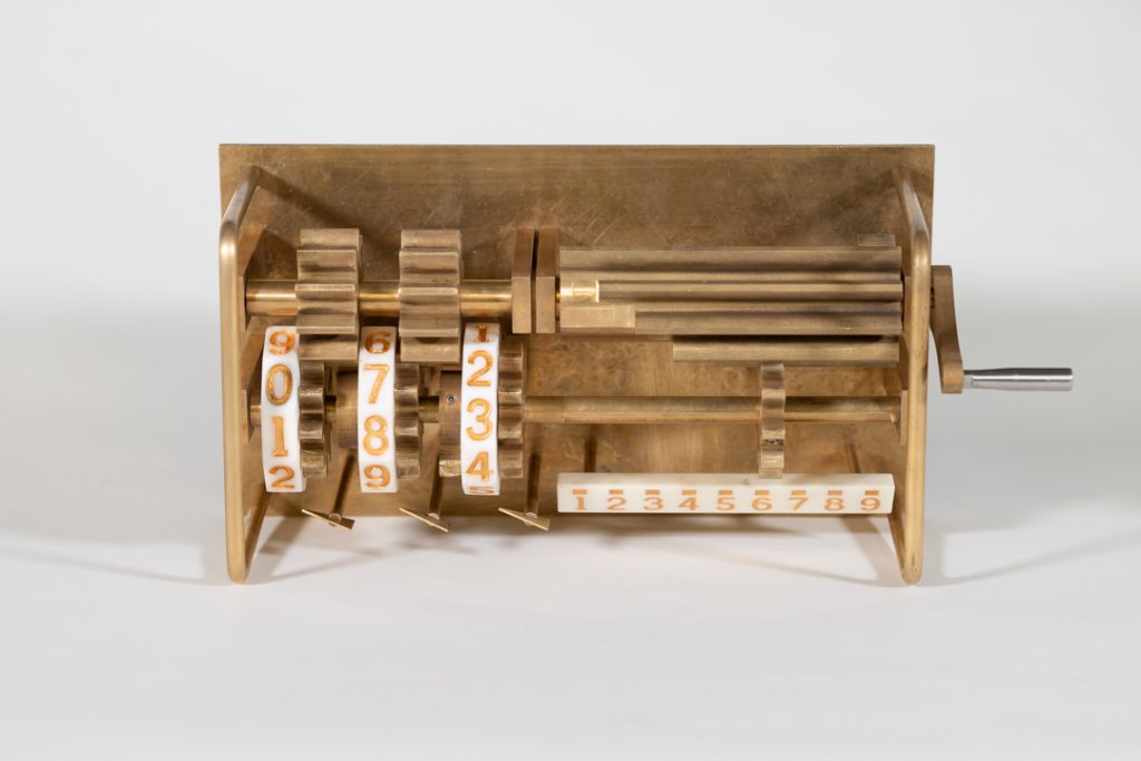 本展品突出表现了莱布尼茨计算器的核心部件——阶梯鼓轮,可通过转动手柄实现加法和乘法运算。