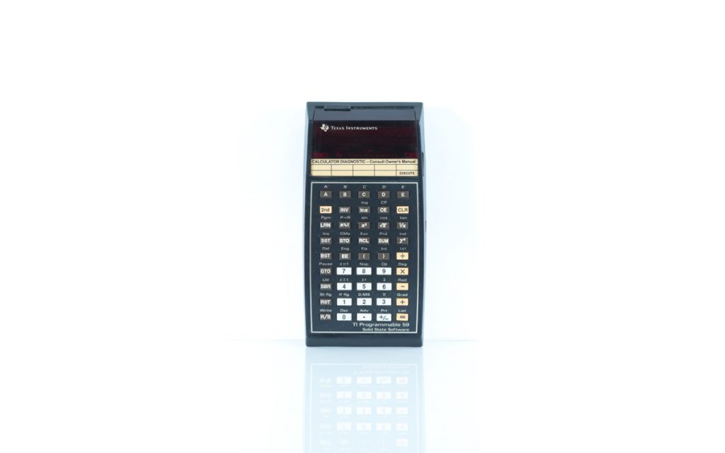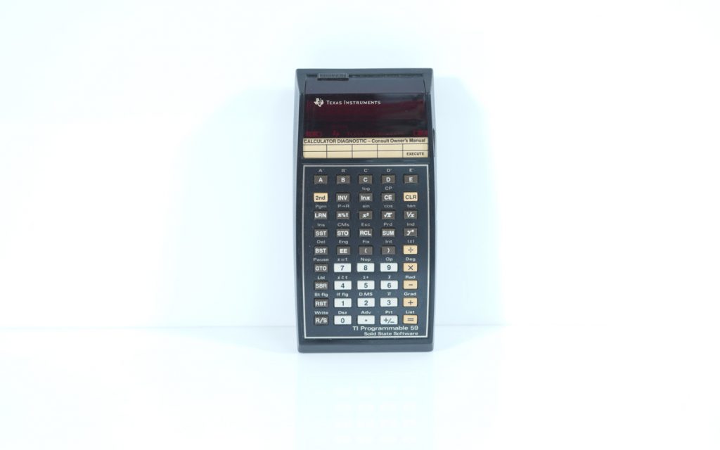 德州仪器公司(Texas Instruments Co.)是美国老牌制造企业, 1967年进入手持式电子计算器市场。TI-59于1977年5月推出,使用4位处理器TMC 0501,可编程的软件模块多达5000个程序,包含矩阵计算、线性方程的解、复杂算法、金融和日历计算等,甚至还有一个简单的游戏,使TI-59成为许多专业人士的有用工具。TI-59还有个特色——磁卡,用户可以把它塞进LED显示屏右边的一个小槽里,程序通常被存储在磁卡上,这样用户就不必每次打开计算器就输入它们了。LED显示屏使用传统的7段数字,但TI-59能够在PC-100A打印机上打印文本,甚至计算器背后电池处还有一个充电连接,以便计算器接通打印机时充电。
